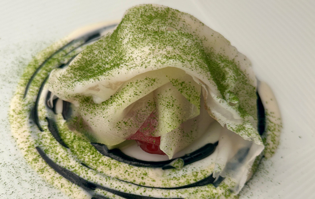 Y sobre el escenario el chayote cocido se ha convertido en un sabroso soporte planchado con grasa de porco Moura, “una especie de cerdo nacido y criado en el estado de Río de Janeiro”, sobre el que descansaban finísimas láminas de lardo de cerdo ibérico y de lomo de atún sazonado con limón y sal. El conjunto ocupaba el centro de dos círculos pintados con dos salsas de sésamo, “una de sésamo negro y otra de sésamo blanco aligerado con yogur de oveja para añadir frescor y acidez”.